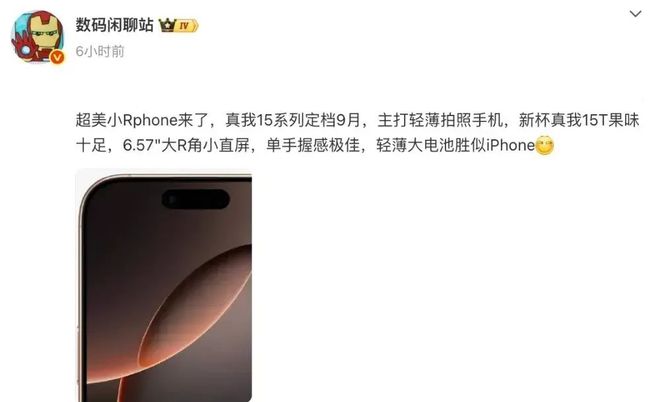 另外,博主@数码闲聊站 的一份爆料中提到过,“超美小Rphone来了,线月,主打轻薄拍照手机,新杯线大R角小直屏,单手握感极佳,轻薄大电池胜似iPhone”。