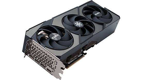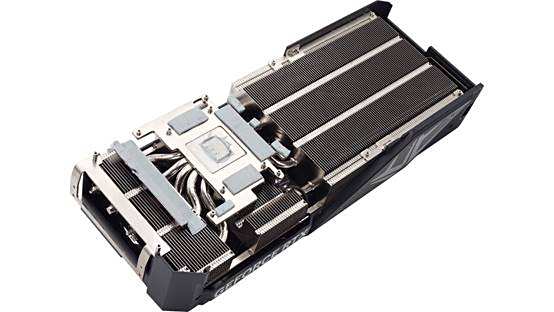 显卡采用三风扇7叶片的配置,支持自动启停功能,直径达到10厘米。正中间的轴流扇叶采用反转设计。风扇采用静音轴承,坚固耐用并使得运行噪音更低,适合长时间高强度的使用环境。