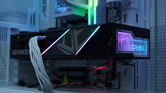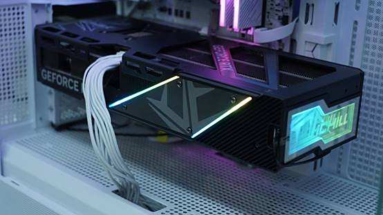 映众RTX5070超级冰龙在外观上和系列70Ti、80还是存在一些区别的。取消了无限镜像深渊灯,从而在侧面装配了iCHILLLogo的RGB灯板。在正面有着更简练的外观,强化了显卡在侧面的视觉点缀,更贴合实际使用场景下的侧面视角。