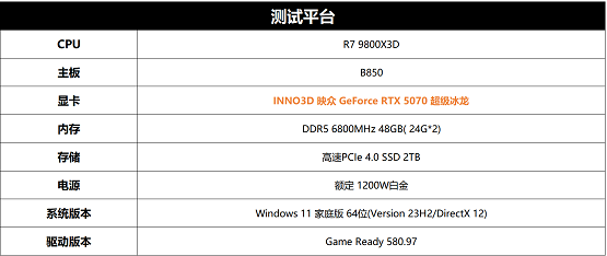 测试平台依旧是以往9800X3D的这套平台,旨在全力发挥出显卡的真实性能。