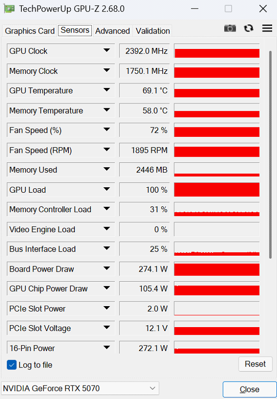 在室温27℃的环境下通过FurMark进行20分钟GPU烤机测试,核心频率稳定在2392MHz,核心温度69℃,显存温度58℃。风扇调度72%,转速在1900转左右,满载表现噪音控制出色。