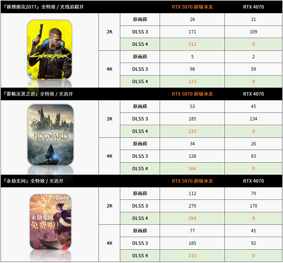 在《赛博朋克2077》、《霍格沃茨之遗》、《永劫无间》三款游戏中,暂且抛开DLSS4不谈,仅仅是DLSS3设置下,RTX5070超级冰龙的领先幅度就非常大,这完全得益于第五代TensorCore更高效的性能发挥。