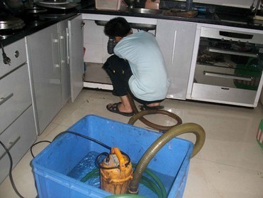 2、:这是我觉得技术含量最高的。一个像氧气瓶(不过要小得多)的气压瓶,外接一个40cm的金属喷嘴。先将堵了的管道注水至离管口10cm左右,将金属喷嘴放入管道,并用湿毛巾缠绕住管道口密封。打开气压开关,听到一声清脆的下水声,工程就结束了。